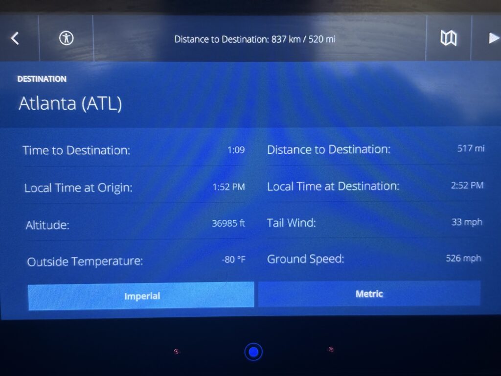 This screen does the opposite of that. It has a field that reads “Local Time at Destination: 2:52 PM” which looks exactly like the answer to the question — what time will it be in Atlanta when I land? Except it isn’t the answer. That field shows the current time in Atlanta right now. To get the actual landing time you have to notice the “Time to Destination: 1:09” field, understand what it means in relation to the destination time, and add them together. The answer is 4:01 PM.